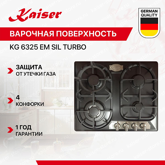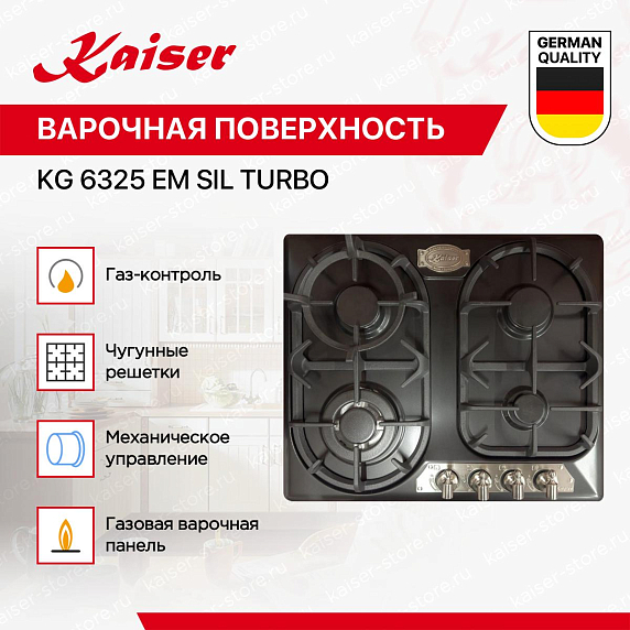 Варочная панель Kaiser KG 6325 EM SIL TURBO — современное кухонное оборудование, которое сочетает в себе функциональность и стильный дизайн. Эта модель выполнена в антрацитовом цвете, который великолепно вписывается в любой интерьер, а бронзовая фурнитура добавляет изысканности и ретро-стиля. Чугунная решетка не только украшает общий вид устройства, но и увеличивает устойчивость посуды во время приготовления пищи.