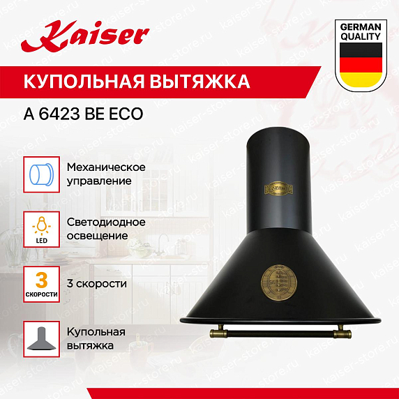 Вытяжка Kaiser A 6423 Be Eco изготовлена в стильном дизайне. Благодаря этому она выглядит очень современно и даже слегка агрессивно, показывая Вашу индивидуальность. Фурнитура подчеркнет изысканный стиль вашей кухни, украшенной элементами лепнины, патины и позолоты. Техника имеет купольный тип и настенный монтаж. Прибор может похвастаться стандартными габаритами, которые будут удобны к встраиванию: высота — 68-104 см ширина — 60 см, глубина — 60 см. Он выполнен в Германии, поэтому гарантированно будет обладать долгим сроком эксплуатации/