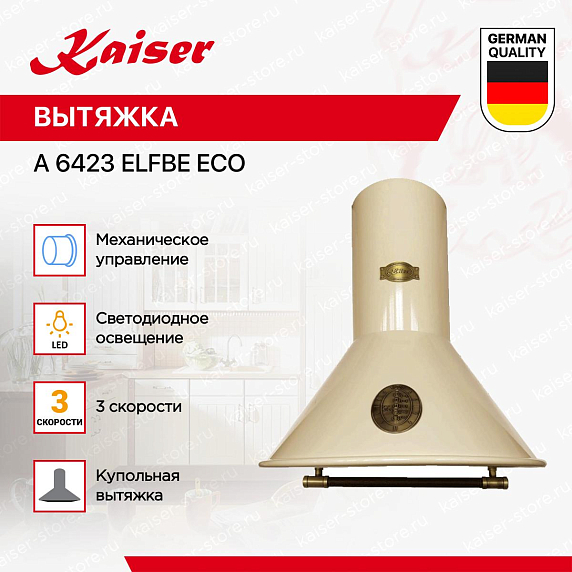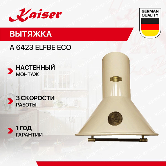 Вытяжка Kaiser A 6423 ElfBe Eco выполнена в стильном цвете «Слоновая кость» и подойдет к любому дизайну кухни, а также подчеркнет ее индивидуальность. Она работает по периметру, благодаря чему достигается наибольшая эффективность очистки. Модель имеет настенный тип монтажа и обладает размерами: высота — 68-104 см, ширина — 60 см, глубина — 60 см. Прибор обладает максимальной производительностью до 820 м³ воздуха в час — для очистки воздуха в большинстве случаев достаточно включить его на первую или вторую скорость. Данная техника понравится каждому члену семьи своим функционалом. Модель прекрасно дополнит классический дизайн кухни и идеально сочетается с приборами этой линейки.