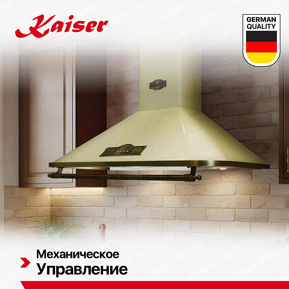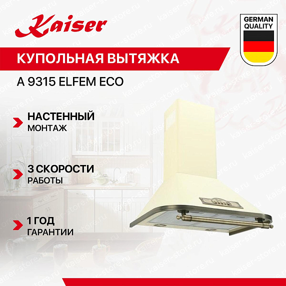 Купольная вытяжка KAISER A 9315 ELFEM ECO выполнена в цвете «Слоновая кость», имеет ширину в 90 см, обладает максимальной производительностью 780 м3/час, а для очистки воздуха в большинстве случаев достаточно включить первую скорость.