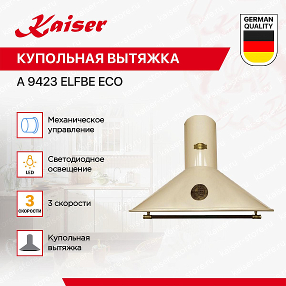 Купольная вытяжка Kaiser A 9423 Elfbe Eco — это идеальное сочетание элегантности и функциональности, созданное в Германии. Она воплощает в себе всю изысканность и превосходство коллекции Retro, которая отличается своим уникальным дизайном и высоким качеством. С ее помощью вы сможете создать в своей кухне атмосферу роскоши и комфорта. Цветовое решение в слоновой кости и античном золоте придает устройству особую изысканность, делая его центральным элементом интерьера. Материал корпуса — эмаль, обеспечивает долгий срок службы и устойчивость к механическим повреждениям. Освещение вытяжки осуществляется с помощью двух светодиодных ламп мощностью по 3 Вт каждая. Это обеспечивает равномерное и яркое освещение рабочей зоны, что делает процесс приготовления более комфортным и безопасным.