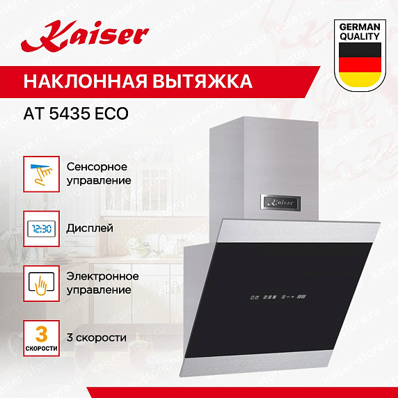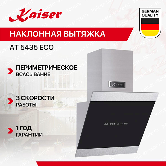 Наклонная вытяжка Kaiser AT 5435 Eco — это современное решение для кухни, которое сочетает в себе функциональность, эффективность и элегантность. Произведенная в Германии, эта вытяжка гарантирует качество и надежность, подтвержденные 12-месячной гарантией. Основной материал конструкции — это стекло и металл, что обеспечивает долговечность и легкость в уходе. Черный цвет придает модели элегантный и современный вид, который легко впишется в любой интерьер. Ширина 50 см, глубина 37.5 см и регулируемая высота от 73.5 до 113.5 см делают эту модель идеальной для средних и больших кухонь. Освещение в вытяжке осуществляется с помощью светодиодной лампы мощностью 3 Вт. Это обеспечивает яркое и равномерное освещение рабочей зоны, при этом энергопотребление остается на минимальном уровне. Управление вытяжкой осуществляется с помощью сенсорных кнопок, что делает ее использование удобным и интуитивно понятным.
