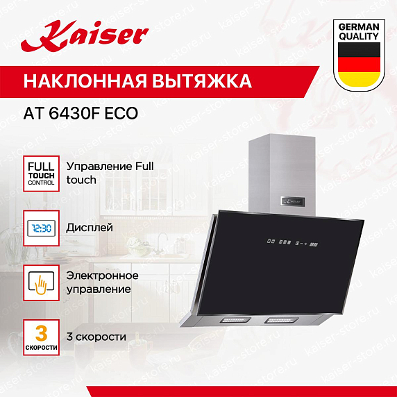 Управление вытяжкой осуществляется с помощью полностью сенсорных элементов Full touch, что делает ее использование удобным и простым. На светодиодном дисплее отображается текущий режим работы устройства. Вытяжка Kaiser AT 6430F Eco имеет три скорости работы, что позволяет выбрать оптимальный режим в зависимости от интенсивности приготовления пищи. Максимальная производительность в режиме отвода составляет 1250 м?/ч, что обеспечивает быстрое и эффективное удаление запахов и жира. При этом уровень шума не превышает 74 дБ, что позволяет сохранить комфорт во время использования устройства. Особенностью вытяжки является наличие периметрического всасывания, которое обеспечивает более равномерное и быстрое удаление воздуха. Кроме того, в устройстве предусмотрен металлический многослойный жироулавливающий фильтр, который можно мыть в посудомоечной машине. Для работы в режиме рециркуляции предусмотрен угольный фильтр.