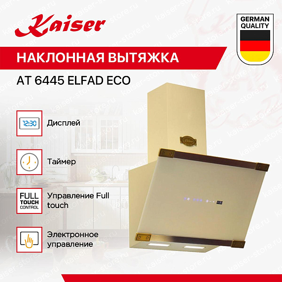 Управление вытяжкой осуществляется с помощью полностью сенсорной панели Full touch. На жидкокристаллическом дисплее отображается информация о текущем режиме работы и другие параметры. Вытяжка Kaiser AT 6445 Elfad Eco оснащена таймером, что позволяет настроить время работы устройства.