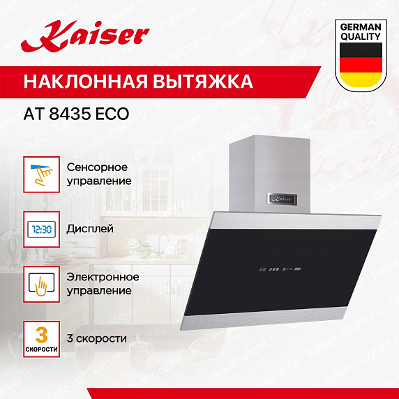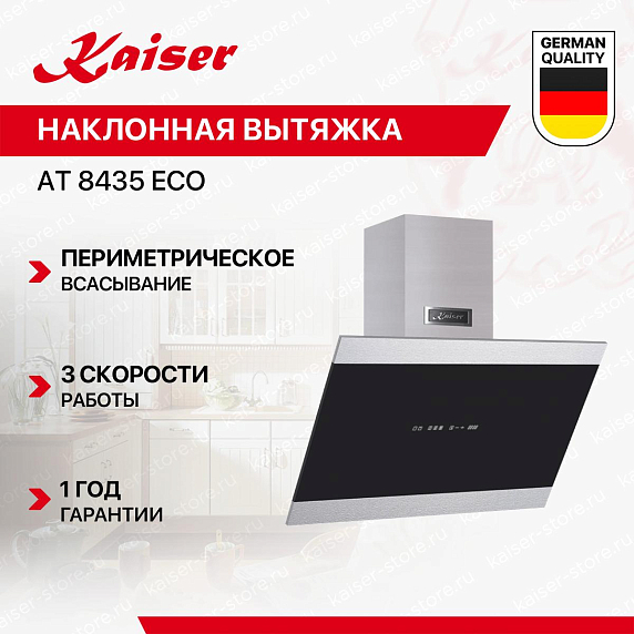 Наклонная вытяжка Kaiser AT-8435 Eco — это современное решение для кухни, сочетающее в себе функциональность, эффективность и стильный дизайн. Устройство произведено в Германии, что гарантирует его высокое качество и надежность. Стильное сочетание черного стекла и металла придает этой модели изысканный вид, а габариты 80×37.5×73.5-113.5 см позволяют ей гармонично вписаться в любой интерьер. Устройство оснащено светодиодной подсветкой, которая обеспечивает равномерное освещение рабочей поверхности. Мощность каждой лампы составляет всего 3 Вт, что делает освещение не только эффективным, но и экономичным. Управление вытяжкой осуществляется с помощью сенсорных кнопок, что делает ее использование максимально удобным и простым.