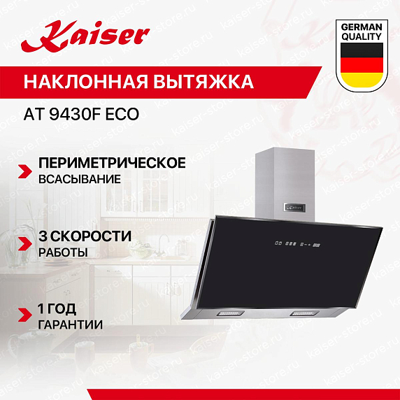 Наклонная вытяжка Kaiser AT-9430F ECO — это высококачественное изделие из Германии, сочетающее в себе элегантный дизайн и функциональность. Она выполнена в стильной черной цветовой гамме, которая легко впишется в любой интерьер. Материалы изготовления — стекло и металл, что обеспечивает надежность и долговечность использования. Данная модель имеет настенный тип монтажа, что позволяет устанавливать ее в любом удобном месте на кухне. Размеры вытяжки составляют 90 см в ширину, 37.5 см в глубину и от 73.5 до 113.5 см в высоту, что делает ее универсальной для различных кухонных пространств. Особенностью вытяжки Kaiser AT-9430F ECO является наличие периметрического всасывания. Это означает, что воздух всасывается не только через центральную часть, но и по периметру, что обеспечивает более эффективную работу устройства. Количество скоростей составляет три, что позволяет подбирать оптимальный режим в зависимости от интенсивности приготовления пищи.