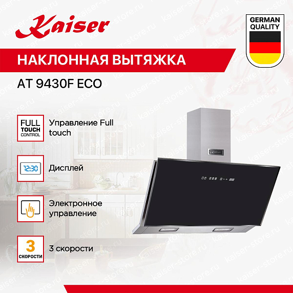 Управление вытяжкой осуществляется при помощи полностью сенсорных элементов Full touch, что делает использование устройства максимально удобным и простым. На светодиодном дисплее отображается необходимая информация о режиме работы. Освещение в вытяжке галогенное, благодаря чему обеспечивается яркое и равномерное освещение рабочей зоны. Всего в вытяжке установлено две лампы мощностью 20 Вт каждая. Вытяжка Kaiser AT-9430F ECO оборудована жироулавливающим фильтром из многослойного металла, который можно мыть в посудомоечной машине. Также в комплекте идет угольный фильтр. Производительность в режиме отвода составляет 1250 м?/ч, что обеспечивает быстрое и эффективное удаление запахов и влаги. Уровень шума в режиме отвода составляет 74 дБ. Потребляемая мощность устройства составляет 385 Вт.
