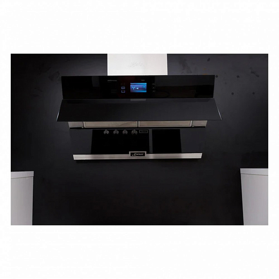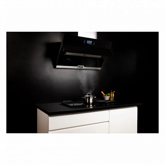 Техника оснащена периметрическим всасыванием и работает в двух режимах: отвод и рециркуляция. Благодаря пяти скоростям работы, можно выбрать оптимальный режим для любой ситуации. Управление вытяжкой осуществляется с помощью полностью сенсорных элементов Full touch, что делает процесс использования еще более удобным и комфортным. На TFT дисплее отображается вся необходимая информация. Кроме того, модель оборудована таймером, что позволяет настроить время работы устройства. Жироулавливающий фильтр, выполненный из металла, можно мыть в посудомоечной машине, что значительно облегчает процесс ухода за вытяжкой. Также в комплекте имеется угольный фильтр. Модель обладает высокой производительностью в режиме отвода — 1200 м³/ч, при этом уровень шума составляет всего 61 дБ. Потребляемая мощность устройства — 183 Вт.