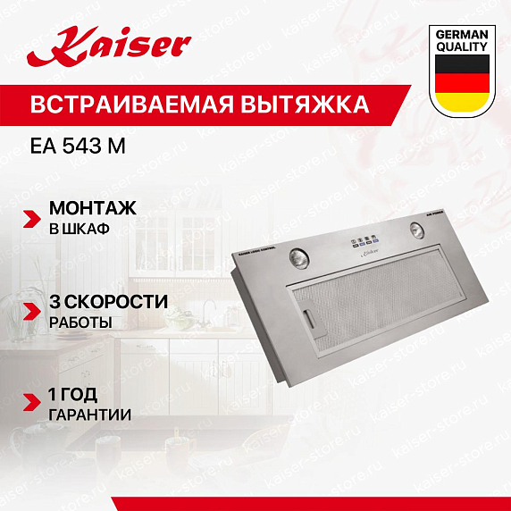 Встраиваемая вытяжка KAISER EA 543 M выполнена в цвете «Нержавеющая сталь». Она имеет ширину 52 см и подойдет для маленьких помещений, обладает максимальной производительностью в 1000 м3/час.