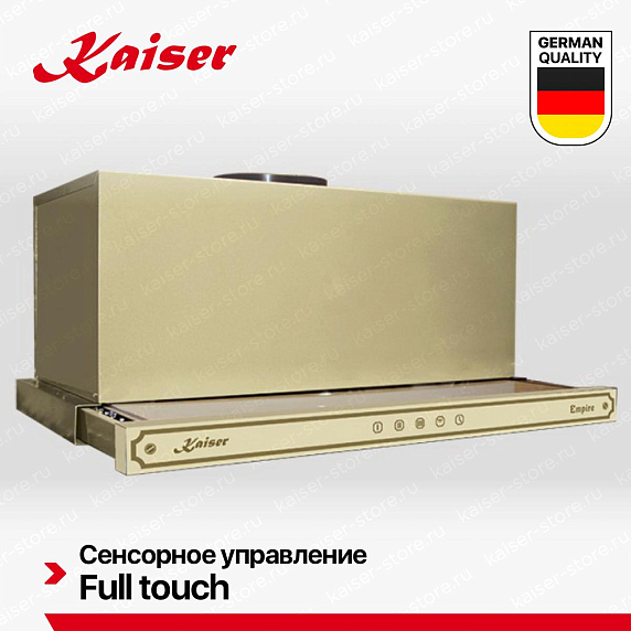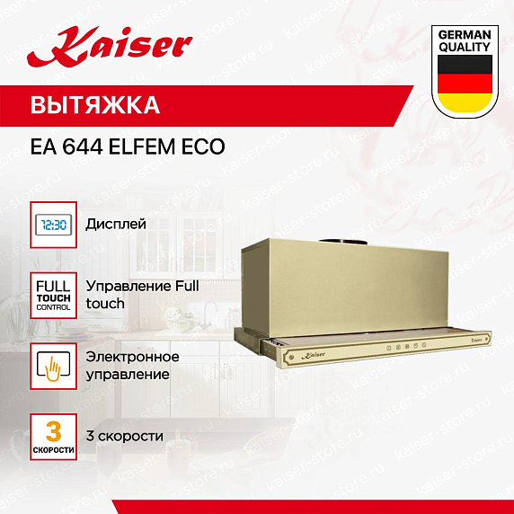 Вытяжка Кайзер EA 644 ElfEm Eco имеет 3 режима работы, которые различаются пропускной способностью и уровнем шума. На первых ступенях скорости устройство отличает тихая работа, что не создает дискомфорт во время нахождения на кухне, просмотров телевизора или беседе. Последний режим удаляет все стойкие запахи за короткое время. Сенсорное управление укрывает электронику от внешних загрязнений. Это комфорт — нет нужды тратить время на очистку кнопок и ручек, точность настроек, поскольку чувствительные датчики улавливают едва заметные перемещения пальцев.