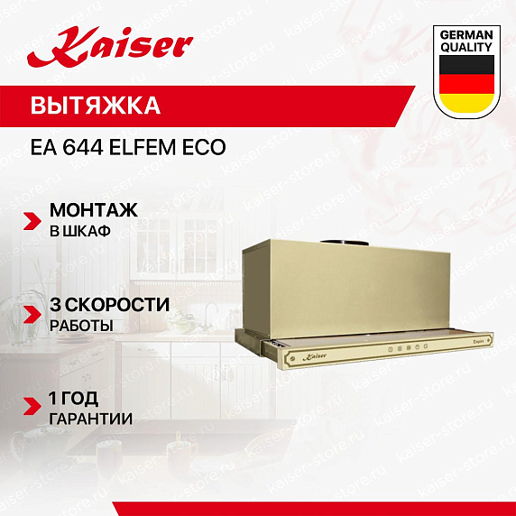 Вытяжка Kaiser EA 644 ElfEm Eco удобна для встраивания и даже на небольшой кухне, так как обладает удобным способом монтажа и размерами: высота — 27 см, ширина — 60 см, глубина — 30,6 см. Данная модель предназначена для полного встраивания в подвесной шкаф, поэтому она идеально впишется в любой интерьер благодаря своему черному цвету. Ее корпус выполнен из нержавеющей стали с элементами закаленного стекла. Эти материалы являются самыми долговечными и устойчивыми к воздействиям внешней среды. Товар произведен в Германии, что гарантирует безопасность эксплуатации девайса.
