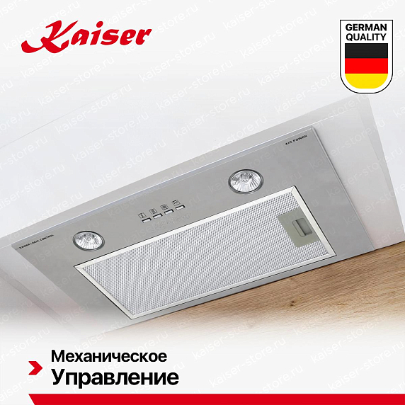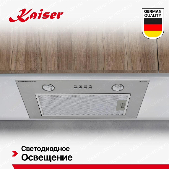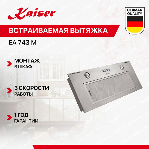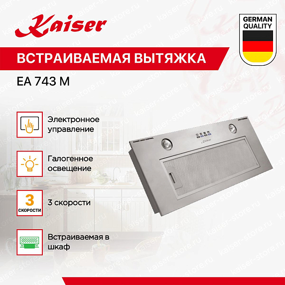 Вытяжка Kaiser EA 743 M представлена в цвете «Металл». Во встроенную комплектацию данного товара входит освещение галогенными лампами. Они равномерно освещают рабочую поверхность, что позволяет готовить на кухне в удобной и приятной световой обстановке. Благодаря высокой производительности в 1000 м3/ч прибор способен быстро очистить даже большую кухню.